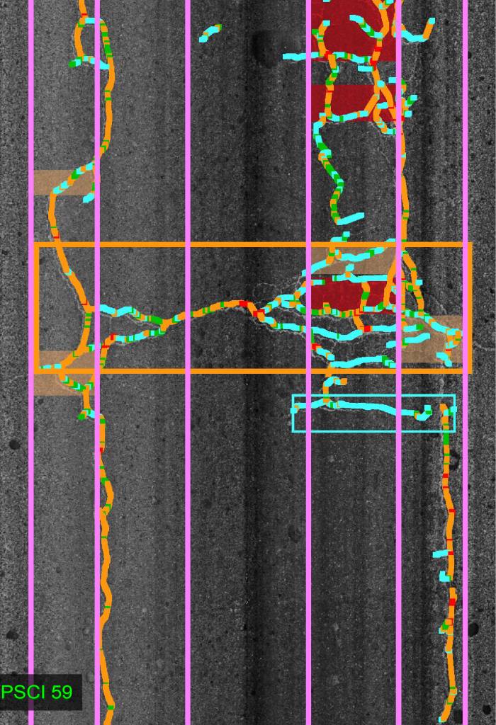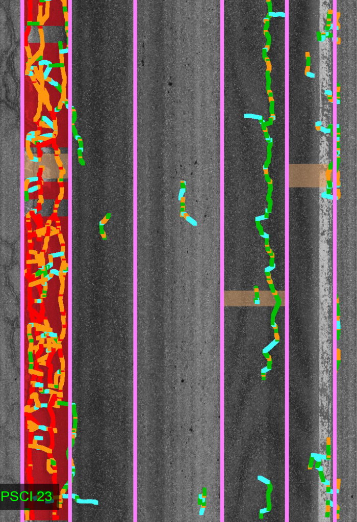 Pavement Surface Cracking Index (PSCI) provides an objective measure of the cracking observed on surveyed pavement that eliminates human subjectivity. Monitoring of the PSCI can provide pavement performance data that can be used as a basis for maintenance, repair and improvement priority planification. PSCI rating, per ASTM 3303 standard, varies from 0 to 100; 0 being the worst possible condition and 100 the best possible condition (no cracking). PSCI value is computed from the weighted Pavement Surface Cracking Metric (PSCM) value, a surface integrity measurement.